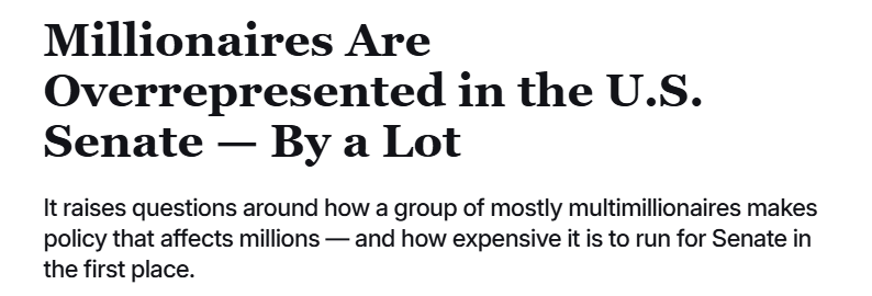 Article #2 – Millionaires in Congress: Here we go! It’s political debate time! To sum this article up, at least 73/100 US Senators have a net worth of greater than or equal to 1 million dollars, which the author (Taylor Giorno) argues is misrepresentative of the middle and lower-class majorities of the United States. This argument is backed up with the statistic that only 7% of Americans have more than 1 million dollars.